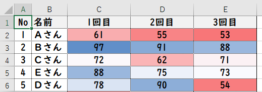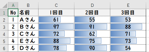 条件付き書式から「セルの強調表示ルール」ではなく「データバー」「カラースケール」「アイコンセット」を選択することで、下記のように数値に応じてグラフや色やマークをつけることができます。